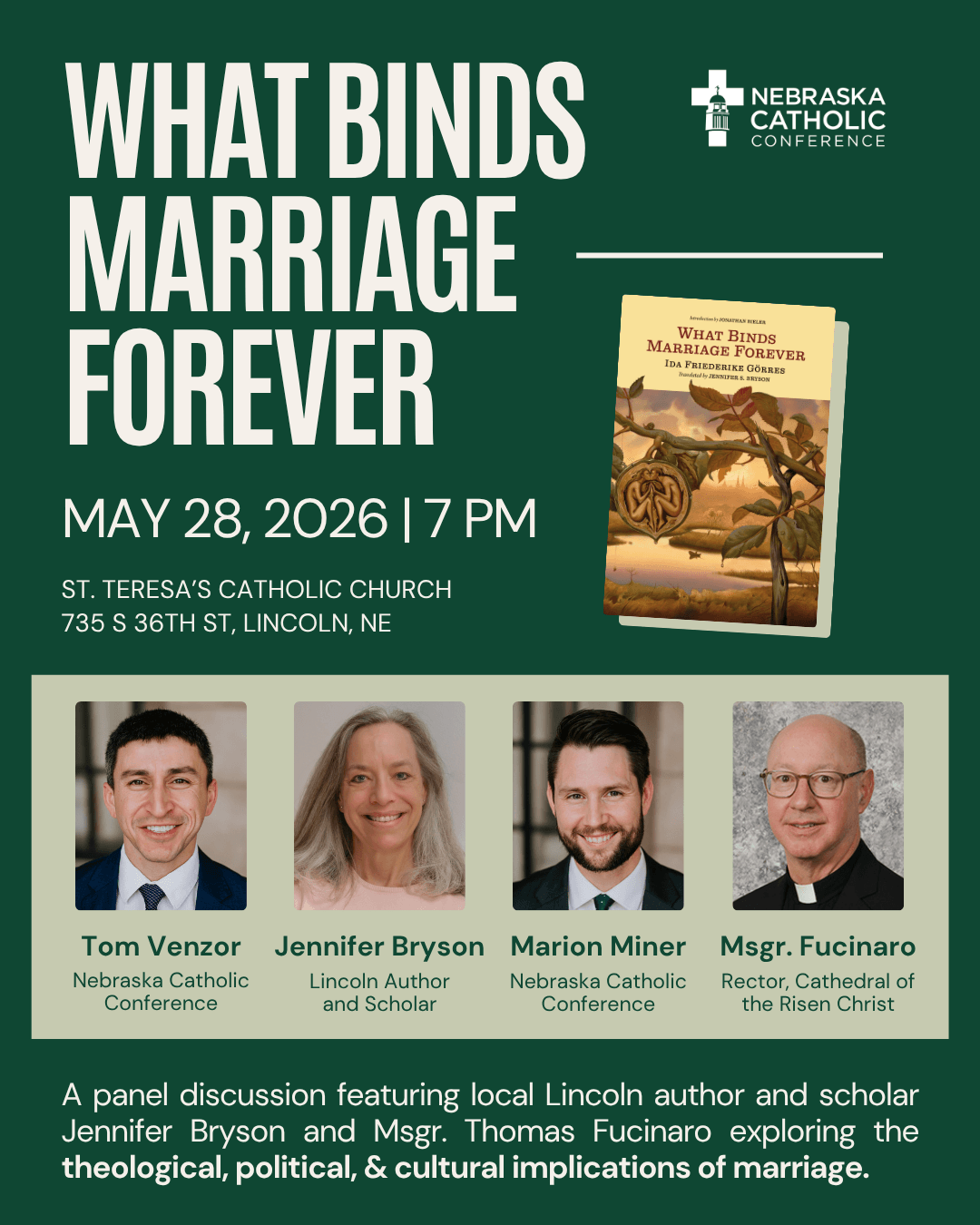 Join the Nebraska Catholic Conference for an insightful panel discussion on the theological, political, and cultural implications of marriage. This event celebrates the work of local Lincoln author and scholar Jennifer Bryson.